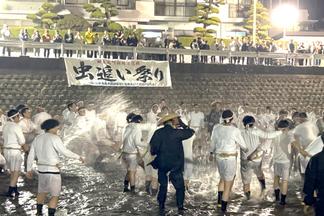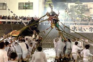 昼の部では、人形は、鉦・太鼓のお囃子に合わせ町内を練り歩きながら、各所で合戦も行います。さらに多くの人々が待っていた「月読神社」、「にじの耳納の里(吉井町)」でも披露され、夜の部は、暗くなった巨瀬川の中で松明を灯しながら、川合戦を繰り広げました。観光客などからは、その迫力に驚きの表情と歓声が上がっていました。