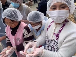 当日、杵つきに初めて挑戦する留学生が多く、最初はぎこちない動きでしたが、児童や地域の方々と声を掛け合いながら、次第に息の合った動きで杵を振るう姿が印象的でした。また、地域の方の指導のもと、あんこを丁寧に包み込むなど、餅づくりの工程一つひとつを体験しました。