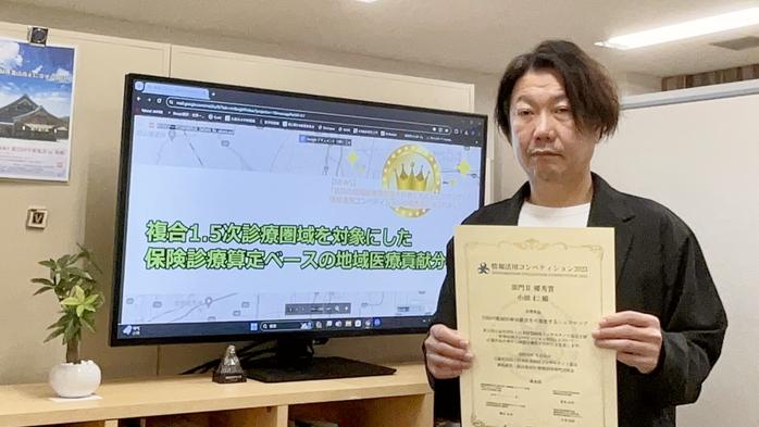 受賞した作品は「自院の地域医療貢献度を可視化するシェアマップ」で、小原准教授が非常勤顧問として医療データを用いたマネジメントの支援を行っている小郡市の顧問先病院で実践した取り組みから得られたものです。これは、当該施設の診療圏域で発生する様々な医療需要に対して、自院の地域医療への貢献度を定量的に測定し、その結果をビジュアル的に可視化することを目的としています。