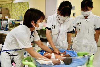 白衣を着て看護部長から辞令を受け取った生徒たちは、大学病院で働く看護師の指導を受けながら、車いすやストレッチャーでの移動や介助、血圧測定の体験、そして病棟で働く看護師の仕事の様子を見学しました。総合周産期母子医療センターでは、聴診器を使って新生児の心音を聞く体験が行われ、参加者は「ドクドクと聞こえた」「大人よりも早い!」と驚きの声を上げていました。