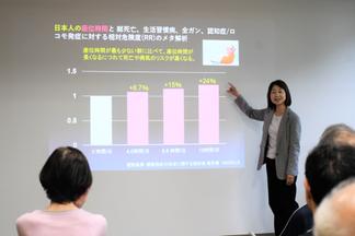 全6回の講座のうち第1回から第4回では、コースに分かれて運動をする前にスポーツ医科学科教員による運動に関する講義が行われます。第1回の講座ではスポーツ医学を専門とする吉田典子名誉教授が「運動は百薬の長」と題して参加者にレクチャーしました。